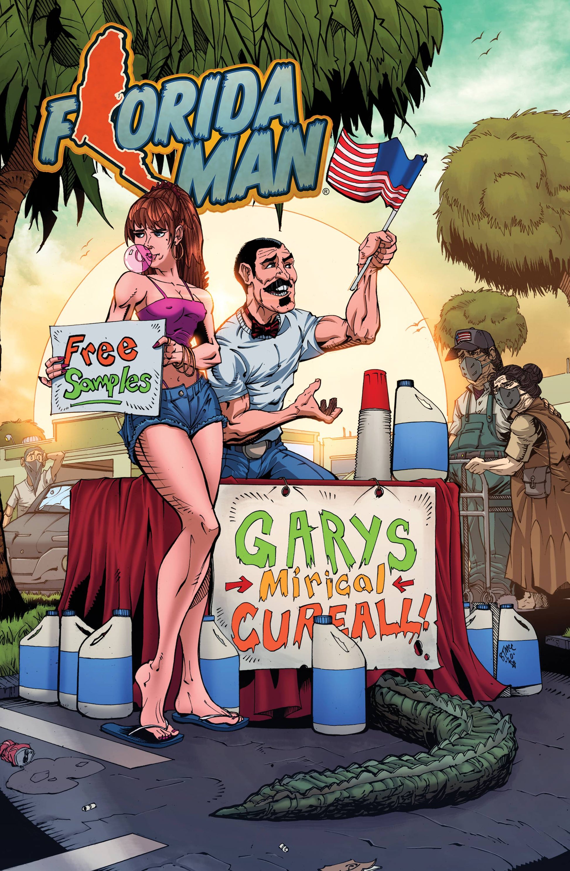 After Gary gets out of jail, his luck begins to change. His lottery numbers come in and he can finally give his gal Krystal a big wedding. The happy couple buy a mansion, luxury SUV, state of the art flamethrowers, and much, MUCH more. But the honeymoon is interrupted by the po-po, causing Krystal to go berserk. Luckily her friend gets it all on a viral video launching Krystal's wrestling career. The hilarious tales continue in this second stupefying issue of Eisner-winner Mike Baron's Florida Man! Florida Man #2 is available with two covers - Main by Elias Martins and Variant by Barry McClain Jr.