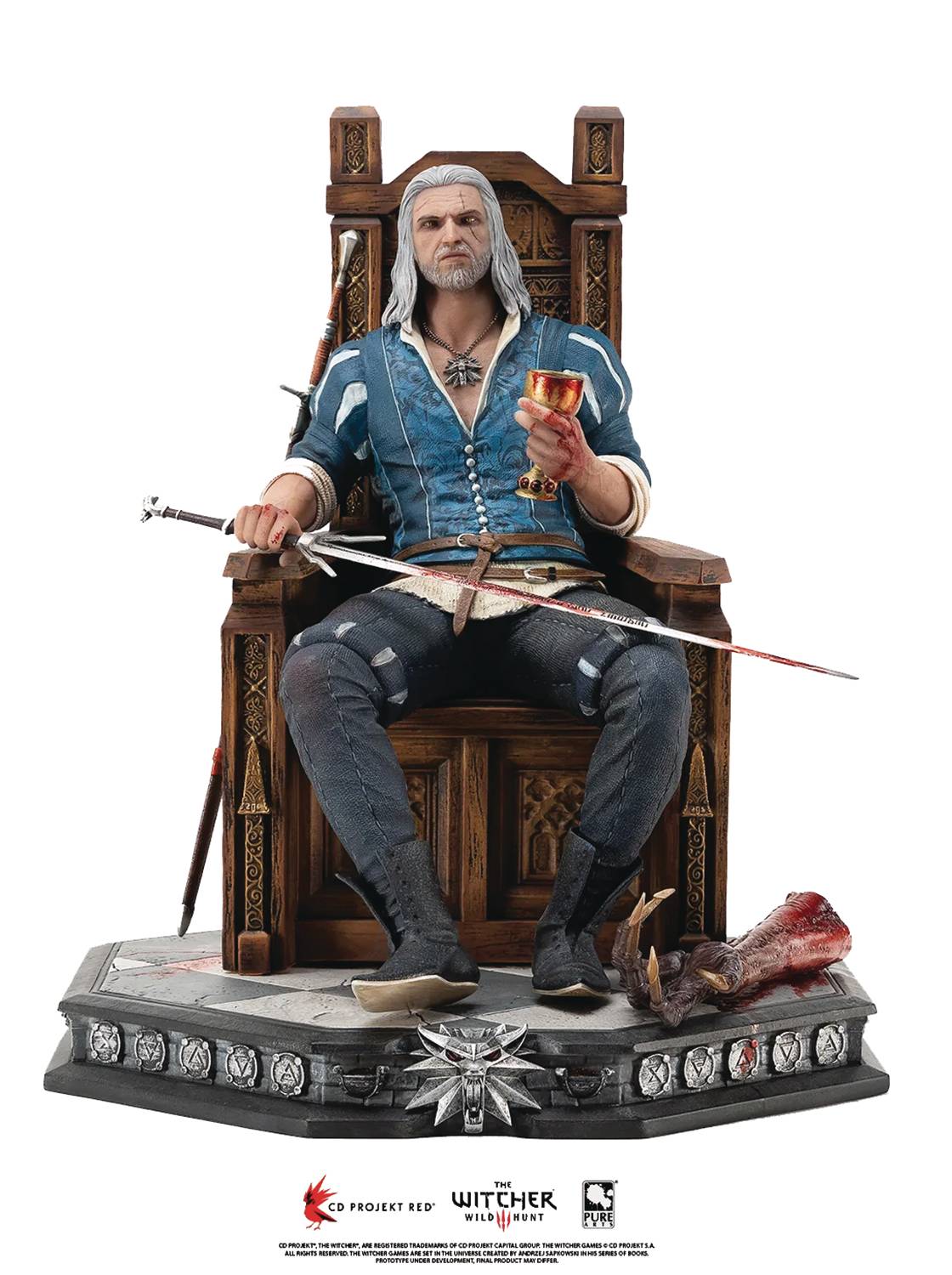 From Pure Arts Limited. PureArts is proud to bring the stunning Blood & Wine cover art to life with Geralt of Rivia gazing intently from his throne, gripping a bloodied chalice in one hand and his enhanced griffin silver sword in the other with the severed arm of the High Vampire Dettlaff at his feet. Made of polyresin, this statue features all the crisp details of the larger Deluxe version, but in a smaller 1/6 format.