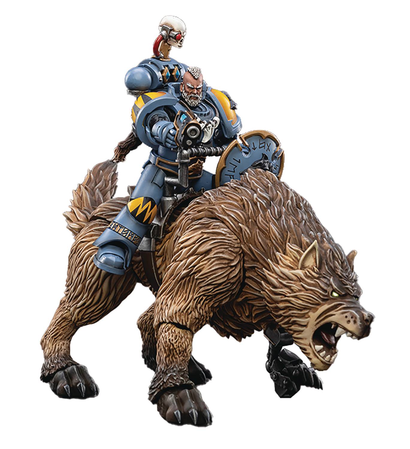 From Bloomage Joytoy Tech. From the Mountains of the Maelstrom come the legendary Thunderwolves, hulking beasts with jaws so strong they can chew through steel. There are several known instances of senior Space Wolves tracking down and 'breaking in' Thunderwolves, and this practice has given rise to the near-mythical Thunderwolf Cavalry - a small but dauntless elite within the ranks of the Wolf Guard who remain absent from any official Imperial records. Joy Toy brings the Thunderwolf Cavalry from Warhammer 40k to life with this new series of 1/18-scale figures. Bjane figure includes interchangable hands and weapon accessories and stands about 6" tall. Thunderwolf figure stands about 3" tall and 12" long.
